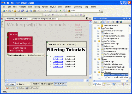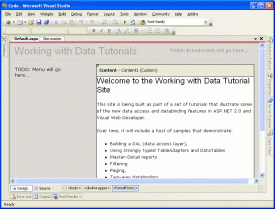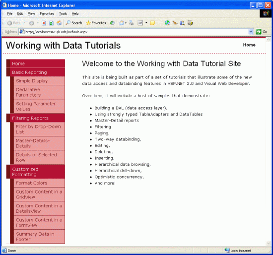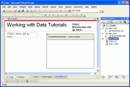 With the site map defined and the master page complete, we now have a consistent page layout and navigation scheme for our data-related tutorials. Regardless of how many pages we add to our site, updating the site-wide page layout or site navigation information is a quick and simple process due to this information being centralized. Specifically, the page layout information is defined in the master page Site.master and the site map in Web.sitemap. We didn't need to write any code to achieve this site-wide page layout and navigation mechanism, and we retain full WYSIWYG designer support in Visual Studio.