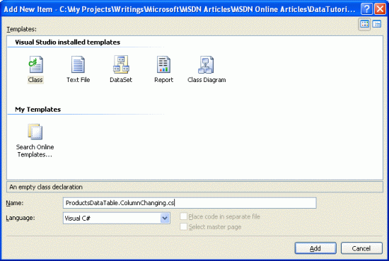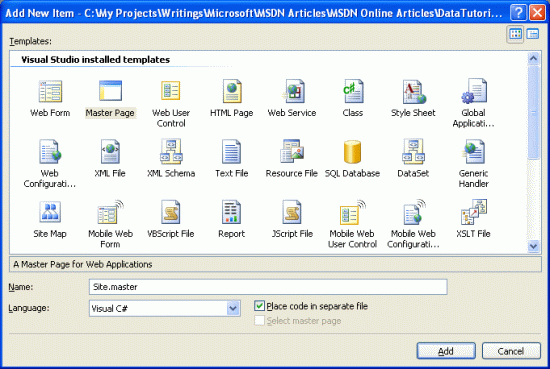 Finally, add new files as shown in the Solution Explorer in Figure 8. When adding each file, remember to check the "Select master page" checkbox.