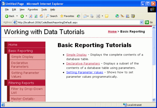 The tutorials in our site are broken down into different categories – Basic Reporting, Filtering, Custom Formatting, and so on – with a folder for each category and the corresponding tutorials as ASP.NET pages within that folder. Additionally, each folder contains a Default.aspx page. For this default page, let's display all of the tutorials for the current section. That is, for the Default.aspx in the BasicReporting folder we'd have links to SimpleDisplay.aspx, DeclarativeParams.aspx, and ProgrammaticParams.aspx. Here, again, we can use the SiteMap class and a data Web control to display this information based upon the site map defined in Web.sitemap.