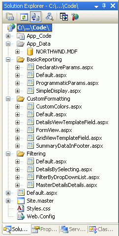 Let's take a moment to add additional ASP.NET page stubs to the site that will eventually hold the various reporting demos. There will be more than 35 demos in total, so rather than creating all of the stub pages let's just create the first few. Since there will also be many categories of demos, to better manage the demos add a folder for the categories. Add the following three folders for now: