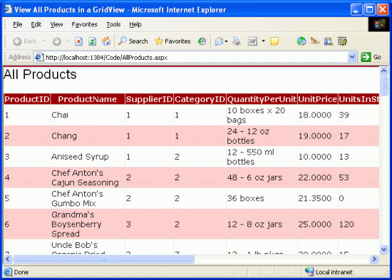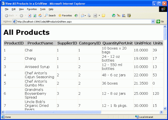 Having completed the Data Access Layer and Business Logic Layer and having a consistent page layout and site navigation defined, we're ready to begin exploring common reporting patterns. In the next three tutorials we'll look at basic reporting tasks – displaying data retrieved from the BLL in the GridView, DetailsView, and FormView controls.