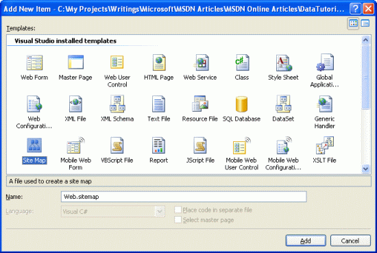 For this tutorial, however, let's use the default site map provider that ships with ASP.NET 2.0. To create the site map, simply right-click on the project name in the Solution Explorer, choose Add New Item, and choose the Site Map option. Leave the name as Web.sitemap and click the Add button.