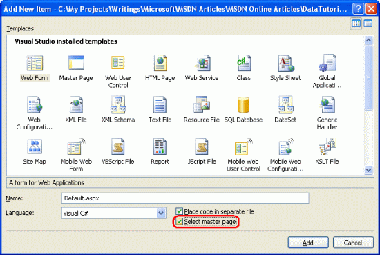 Figure 5. Add a New Web Form, Checking the "Select master page" Checkbox